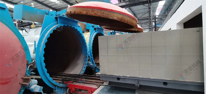 蒸壓養(yǎng)護是對加氣混凝土坯體進行高壓蒸汽養(yǎng)護,對加氣混凝土而言,只有經過一定的溫度和足夠時間的養(yǎng)護,坯體才能完成必要的物理化學變化,從而達到滿足建筑施工的強度需要。  蒸壓養(yǎng)護工序決定了加氣混凝土內在性能的最后形成。 裝入蒸養(yǎng)釜: 養(yǎng)護車上坯體被運至蒸養(yǎng)釜, 在釜中受到高壓蒸汽的養(yǎng)護