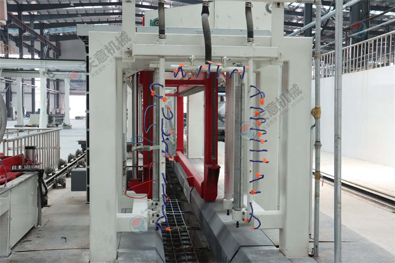 脫模后的坯體連同側板一起放置在切割小車上,切割小車由減速電機驅動行走,通過縱向切割機完成縱向切割,切割小車繼續(xù)行走至橫向 切割機中間位置停止后,由小車置換裝置將側板連同坯體抬起,切割小車退回翻轉行車底下進行下一次承載脫模后的坯體,另外一部切割小車 進入置換裝置底下后, 置換裝置將側板連同坯體放置該切割小車上后,橫向切割動作后啟動進行橫向切割動作,切割完成后,切割小車再行走至地行車底下,再由 翻轉去底行車將坯體去底(連側板)吊至蒸養(yǎng)小車上,切割小車范圍原始位置進行下一個切割循環(huán)。