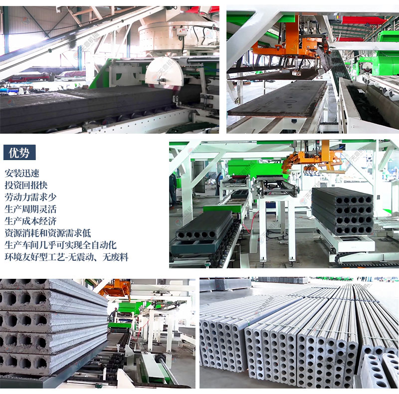 擠壓墻板生產(chǎn)線結(jié)構(gòu)緊湊,自動(dòng)化程度高,設(shè)備主機(jī)固定,墻板成型時(shí)物料受擠壓和振動(dòng)同時(shí)作用,連續(xù)自動(dòng)擠壓振搗成型,保證墻板具有良好的密實(shí)性和外形尺寸,成型后進(jìn)行初凝養(yǎng)護(hù)。板坯移動(dòng)方便,場(chǎng)地使用靈活、利用效率高。成型工段推料擠壓螺旋變頻調(diào)速,由中央控制器調(diào)整控制灰渣板成型的密實(shí)程度,實(shí)現(xiàn)灰渣板的連續(xù)自動(dòng)流水線生產(chǎn)。由于采用低水灰比的干硬性混合料擠壓成型,可得到強(qiáng)度和密實(shí)度較高的空心墻板。自動(dòng)化連續(xù)生產(chǎn),效率高,質(zhì)量一致性高,保障了墻板品質(zhì)。廣泛用于框架結(jié)構(gòu)和鋼結(jié)構(gòu)建筑物。